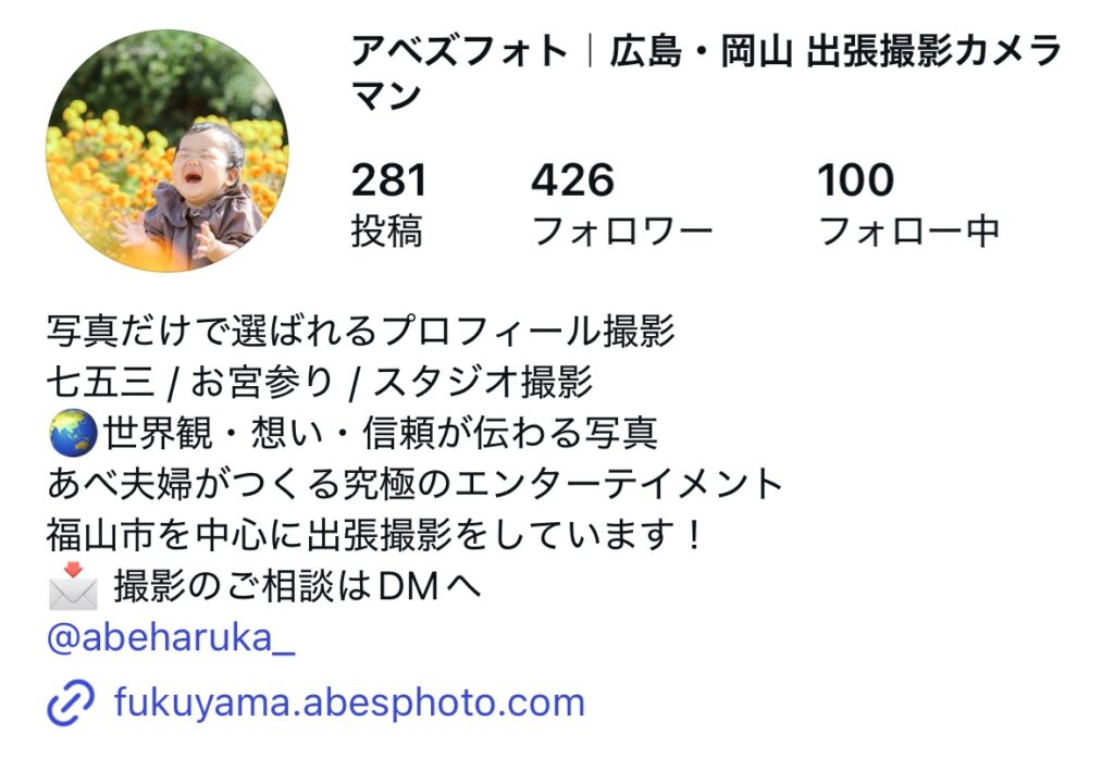 あべはるかさんは、Abe’s PHOTOという写真撮影の会社を経営していて、福山市を中心に出張カメラマンをしているようです。