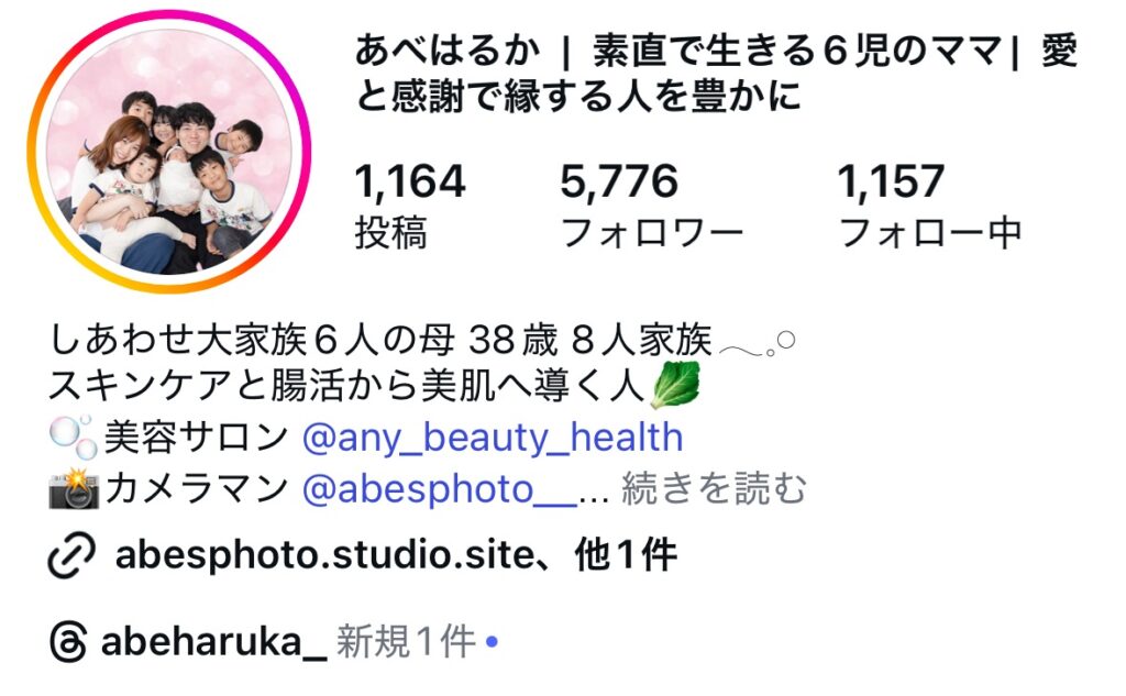 あべはるかさんは、8人家族での生活や出産についてのレポートなどを、インスタグラムで発信しています。
