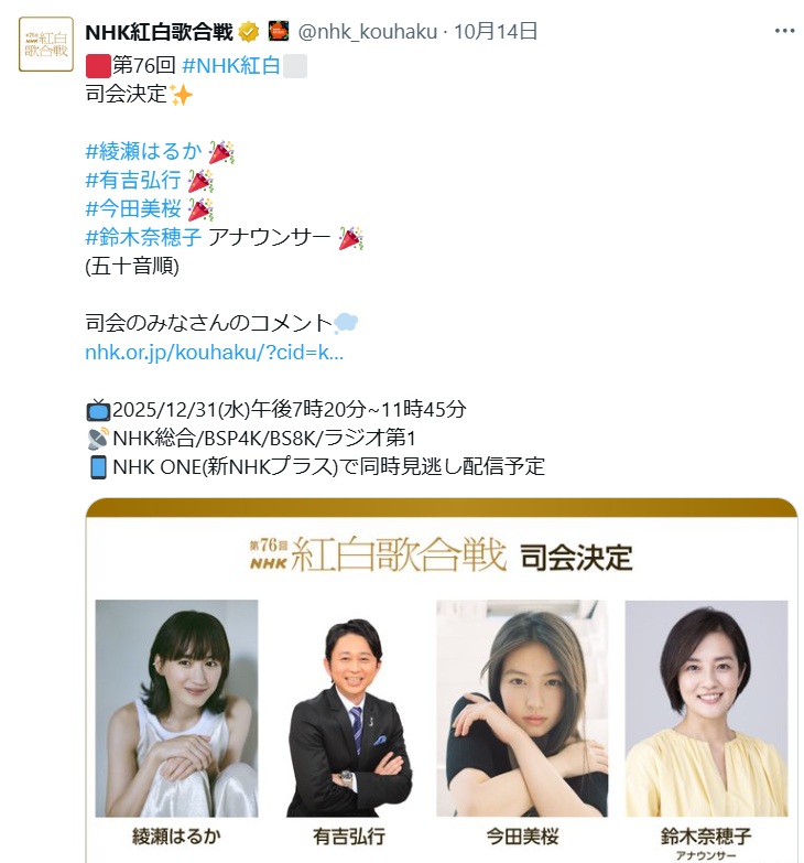 ジャニーズファンからはSixtonesはどうなの?という声が聞こえてきそうですが、司会者に綾瀬はるかが内定したため、おそらく事務所がNGを出すのではないかと予想しました。