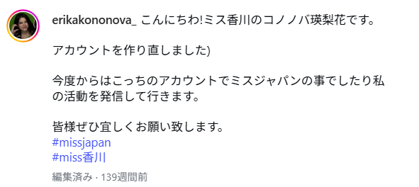 コノノバ瑛梨花さんのインスタグラムによると、ミス香川で2023年にはミスジャパンにも参加していたようです!