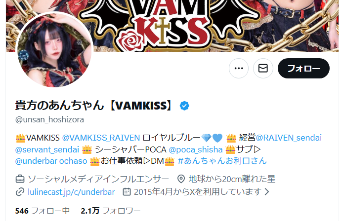あんさんは、コンセプトカフェ『RAIVEN』の経営者であり、アイドルグループ『VAMKISS』のメンバーです。
