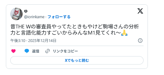 駒場さんの分析力や言語化する力が素晴らしいという声が出ているので、審査員に選ばれるのも納得ですよね。