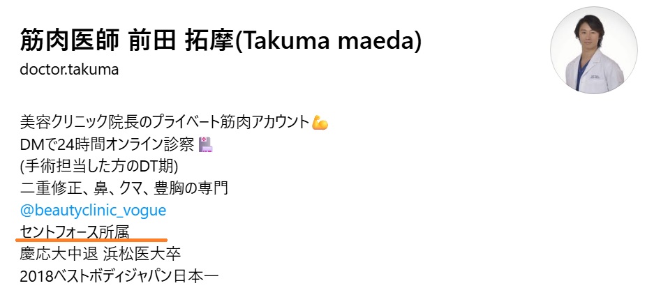 SNSでは、「筋肉医師」の肩書で、発信活動をしており、セントフォースにも所属しているようです!
