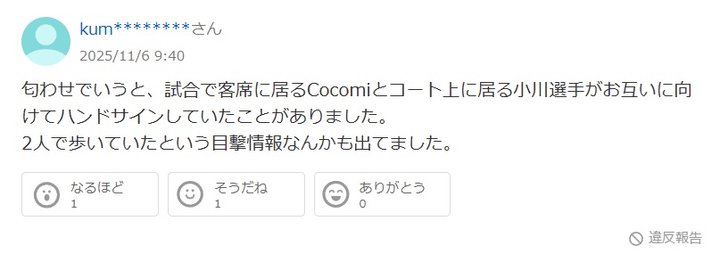 SNSでは小川選手がcocomiがいる客席に向けてハンドサインを送っていた、という情報が見つかりました。