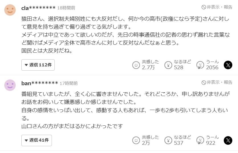 「発言が感情的だった」と指摘があり、前任の山口氏のほうがよかったとの意見もあります。