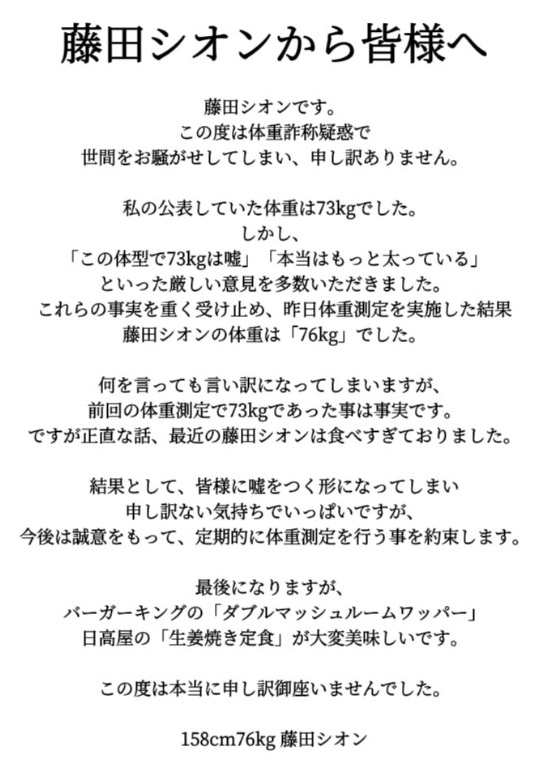 藤田シオンさんはXで、アイドル時代に50kg程度だった体重が、現在73kgになったと投稿していました。