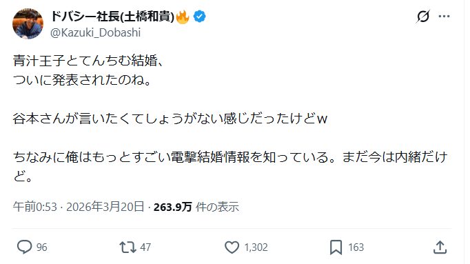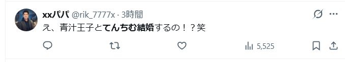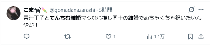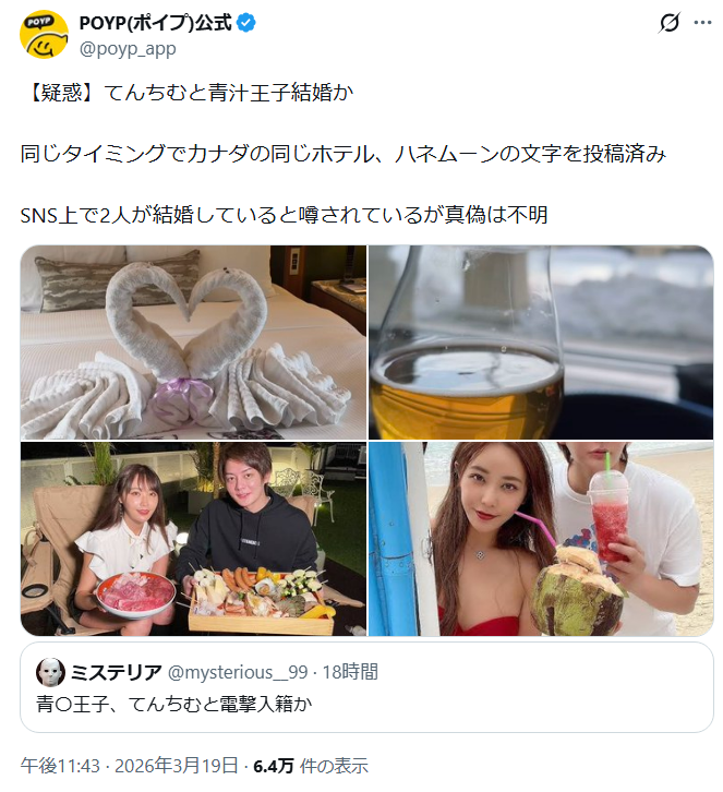 2026年3月20日現在、SNSで、てんちむさんと青汁王子が電撃結婚するのではないかと話題になっっています。