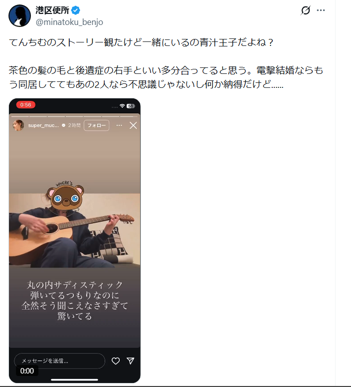 てんちむさんのインスタグラムのストーリーに、顔を隠した男性が、ギターを弾く姿が映っていました。