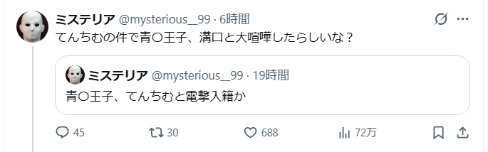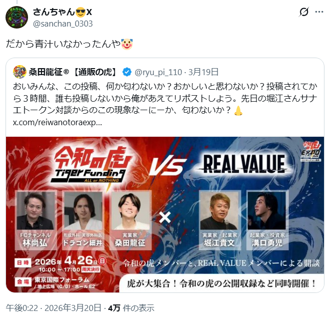 さらに、てんちむさんと青汁王子に近い桑田龍征さんが、以下のような投稿をしています。