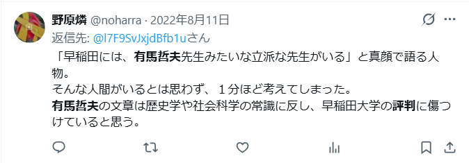 これらの理由により、有馬哲夫さんが、世間から「早稲田大学の評判を下げている」と言われているようです。