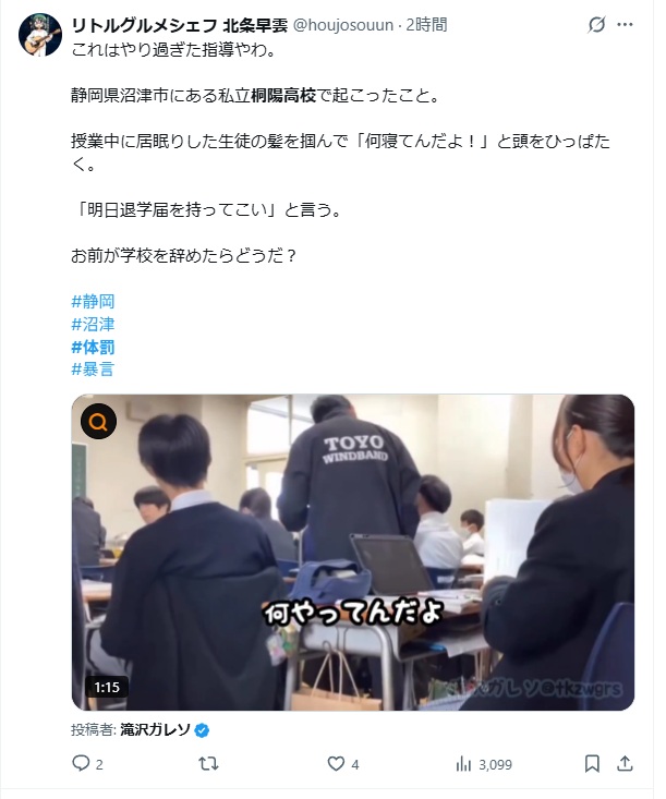 桐陽高校の教師が居眠りをしていた生徒を叱咤している動画がSNSで拡散され、体罰ではないかと話題になっています。