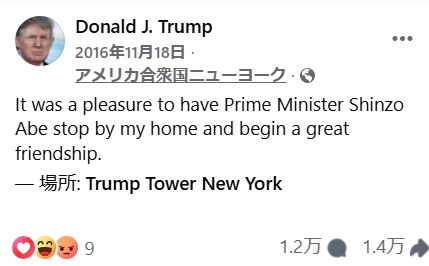 トランプ大統領が初めて大統領選に勝利した直後で、安部元総理が最も早くトランプ大統領に会いに行った首脳と言われています。