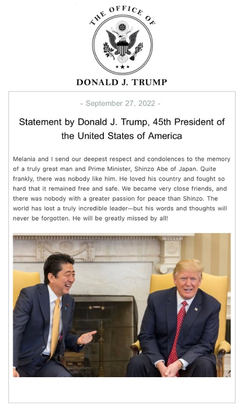 2022年に安部元総理が暗殺された際にトランプ大統領はこのようなメッセージを贈っています。