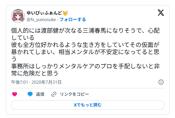 渡部健さんは、2020年のスキャンダルによって強烈なストレスを受けました。