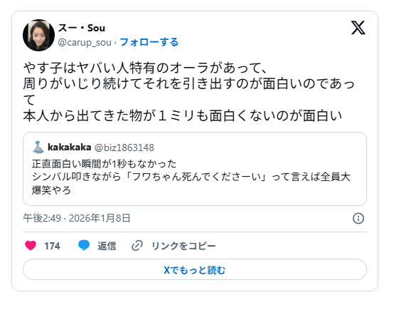 SNSでは、「フワちゃんは戻ってきたけど、やす子さんが消えた」と噂されています。