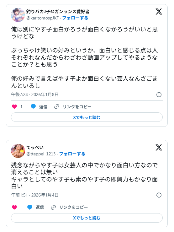 人気がないという人もいますが、こんなにフォロワーが多いということは、それだけやす子さんを応援する人も多いということでしょう。