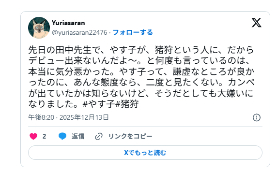最近でも、ジャニーズジュニアの猪狩蒼弥さんに対し、「だからデビューできない」などの失言をし、炎上していました。